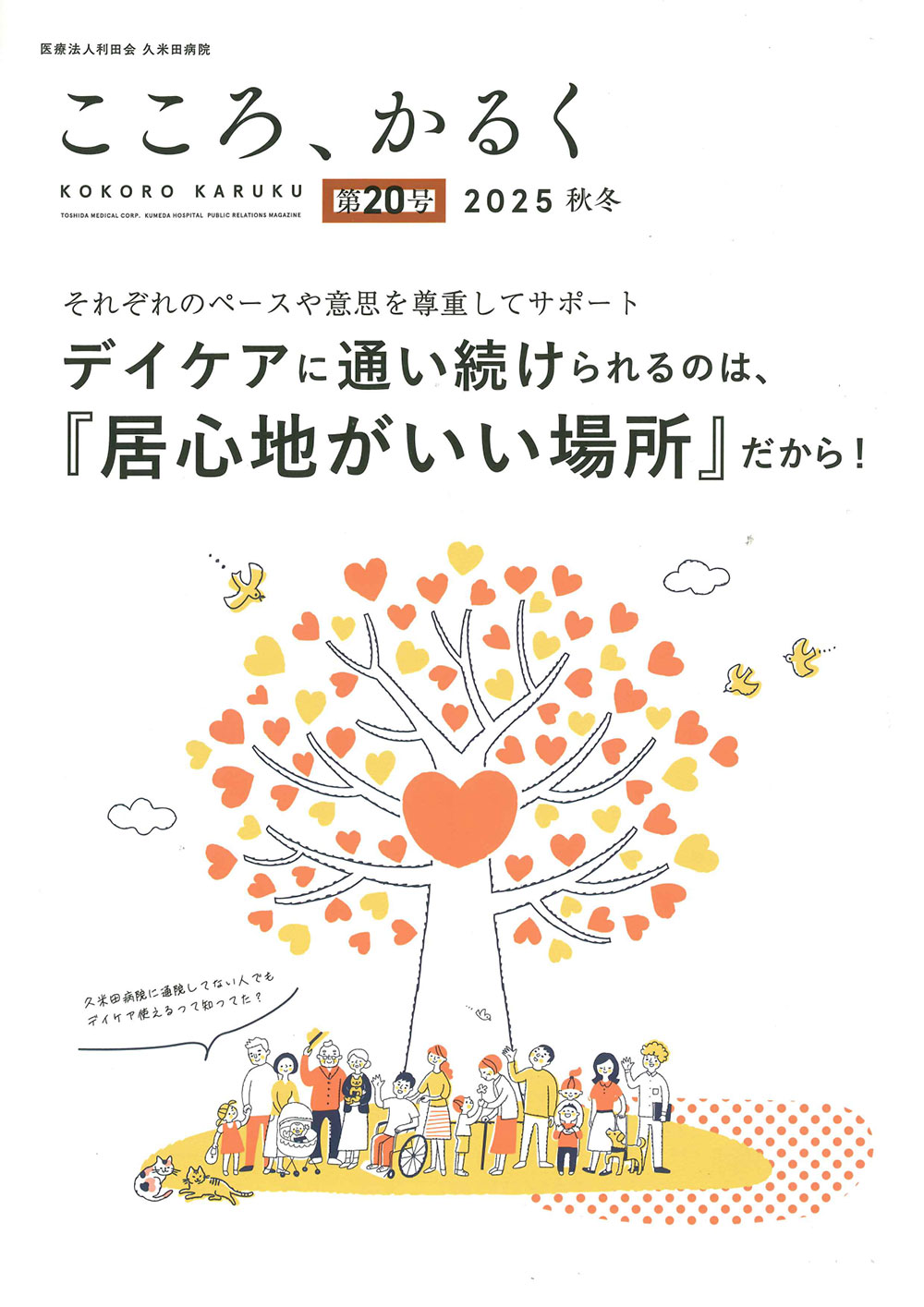 病院紹介 ホーム 病院紹介 こころ、かるく 久米田病院 広報誌 こころ、かるく 久米田病院 広報誌 最新号 デイケアに通い続けられるのは、 『居心地がいい場所』だから! 「こころ、かるく」第20号【2025年秋冬】 詳しくはこちら 2025年発行 慢性期に寄り添う病棟での工夫、『大ワザ・小ワザ・合わせワザ!』 「こころ、かるく」第18号【2025年春夏】 2024年発行 【脳血管疾患】【運動器疾患】【廃用症候群】精神科でできる、疾患別リハビリテーション 「こころ、かるく」第18号【2024年秋冬】 物価高にも、災害にも負けない 患者さんを食で支える、病院の「栄養部」。 「こころ、かるく」第17号【2024年春夏】 2023年発行 看護師の「気づく力」が精神科の在宅ケアを支える 「こころ、かるく」第16号【2023年秋冬】 安全に「外出する生活」のリズムを取り戻した方々の声をご紹介! 「こころ、かるく」第15号【2023年春夏】 2022年発行 暮らしのトレーニングで、退院後の生活が「ととのう!」 「こころ、かるく」第14号【2022年秋冬】 「早めの受診」で、認知症との付き合いが変わる。 「こころ、かるく」第13号【2022年春夏】 過去の久米田病院 広報誌 2021年発行 「こころ、かるく」第12号【2021年秋冬】 「こころ、かるく」第11号【2021年春夏】 2020年発行 「こころ、かるく」第10号【2020年秋冬】 「こころ、かるく」第9号【2020年春夏】 2019年発行 「こころ、かるく」第8号【2019年秋冬】 「こころ、かるく」第7号【2019年春夏】 2018年発行 「こころ、かるく」第6号【2018年秋冬】 「こころ、かるく」第5号【2018年春夏】 2017年発行 「こころ、かるく」第4号【2017年秋冬】 「こころ、かるく」第3号【2017年春夏】 2016年発行 「こころ、かるく」第2号【2016年秋冬】 「こころ、かるく」創刊号【2016年春夏】