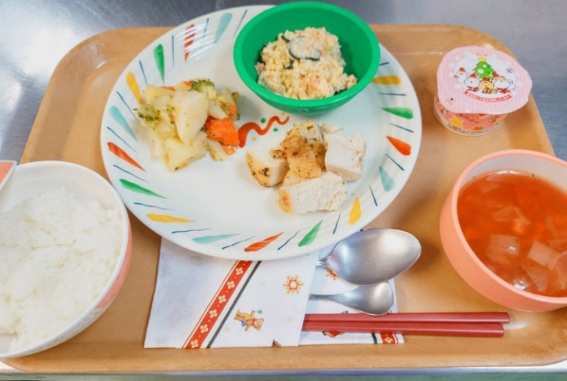 今年のクリスマスは、あいにくの雨でしたが、病院併設のデイケア施設(ゆうパル)にて、クリスマスメニューをご提供しました。チキンの香草焼きや彩り豊かな野菜料理、トマトのスープ、デザートにはムースをお楽しみいただきました。
