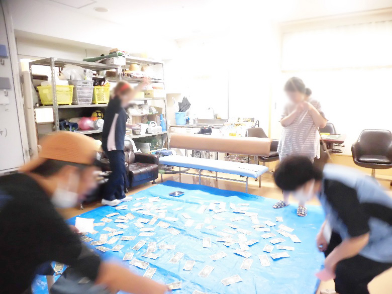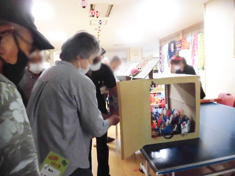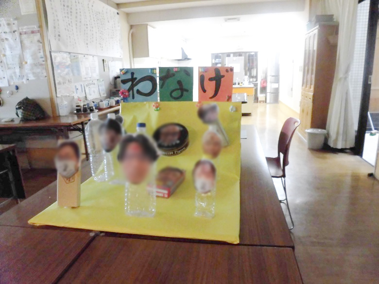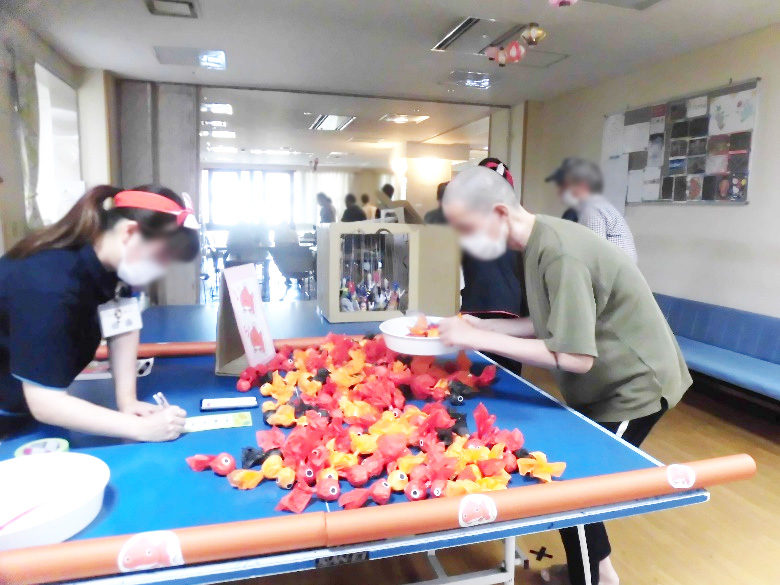 8月22日(金)、夏の風物詩「デイケア縁日」を開催しました。射的、金魚すくい、輪投げ、千本釣り、お金釣り、スリーシェルゲーム(手品)の6つのゲームを用意しました。