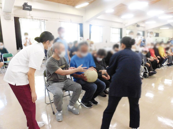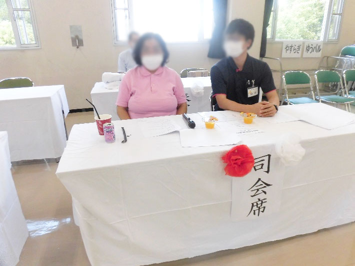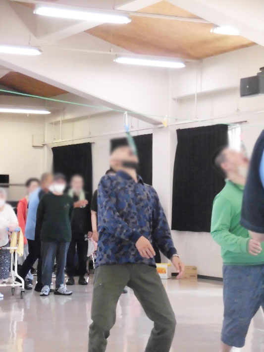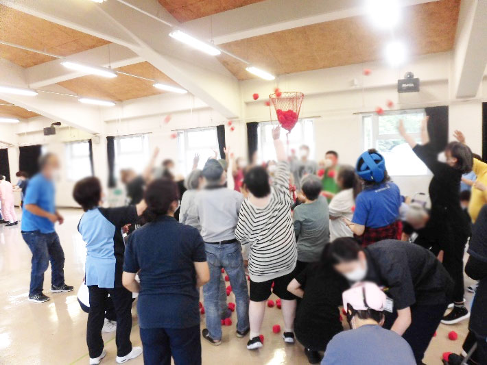 デイケアからは、メンバーさんが司会を務めてくださいました。種目は、紀伊國屋競争、ボール送り競争、うまい棒食い競争、紅白玉入れの4種目です。どの競技も盛りあがり、皆さん楽しんで参加されていました。