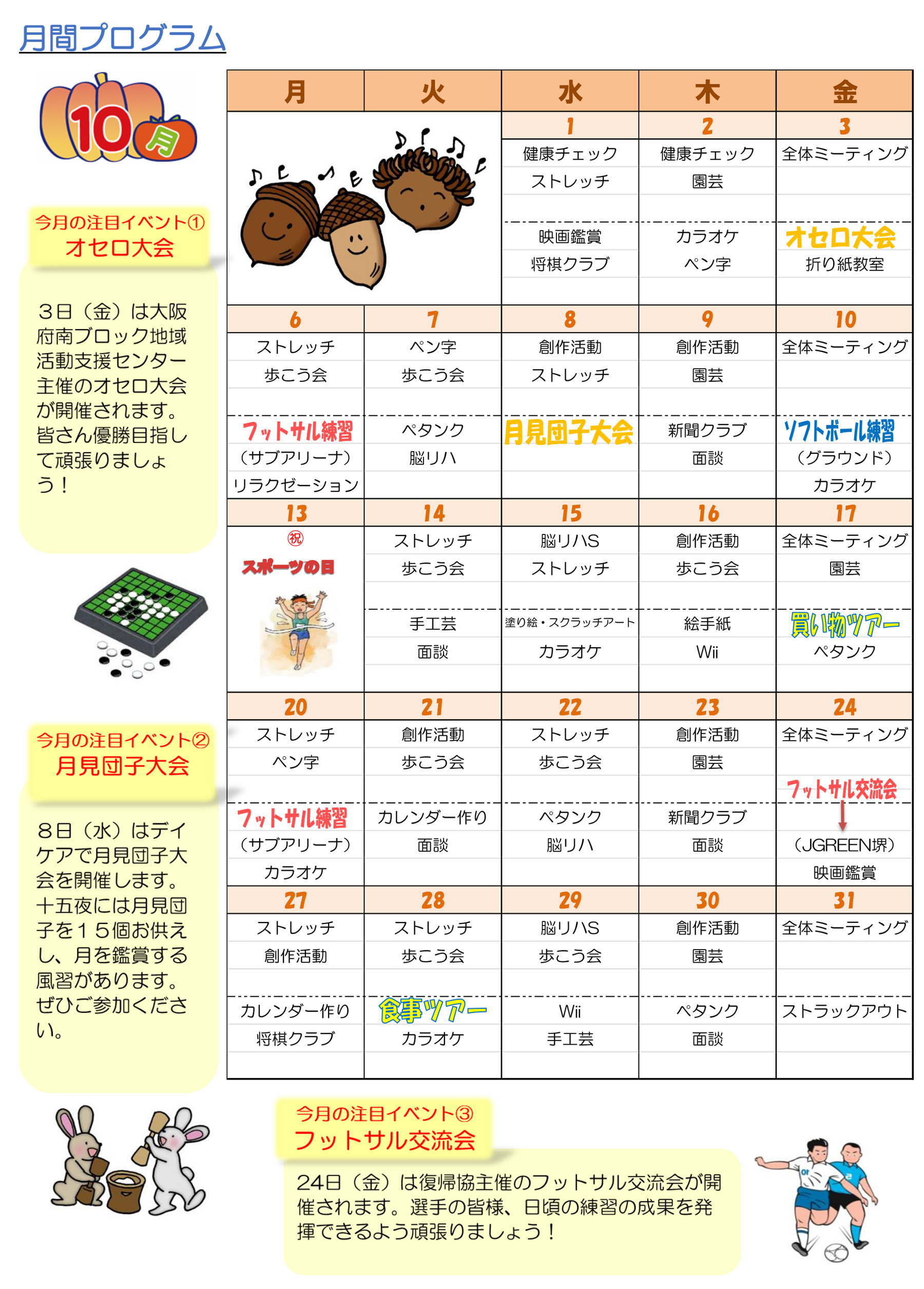 診療案内 ホーム 診療案内 デイケア 月間プロブラム デイケア(月間プログラム) デイケアとは? 活動内容 月間プログラム 月間プログラム 2025年10月 クリックで拡大します 2025年9月 クリックで拡大します 過去のプログラムはこちら